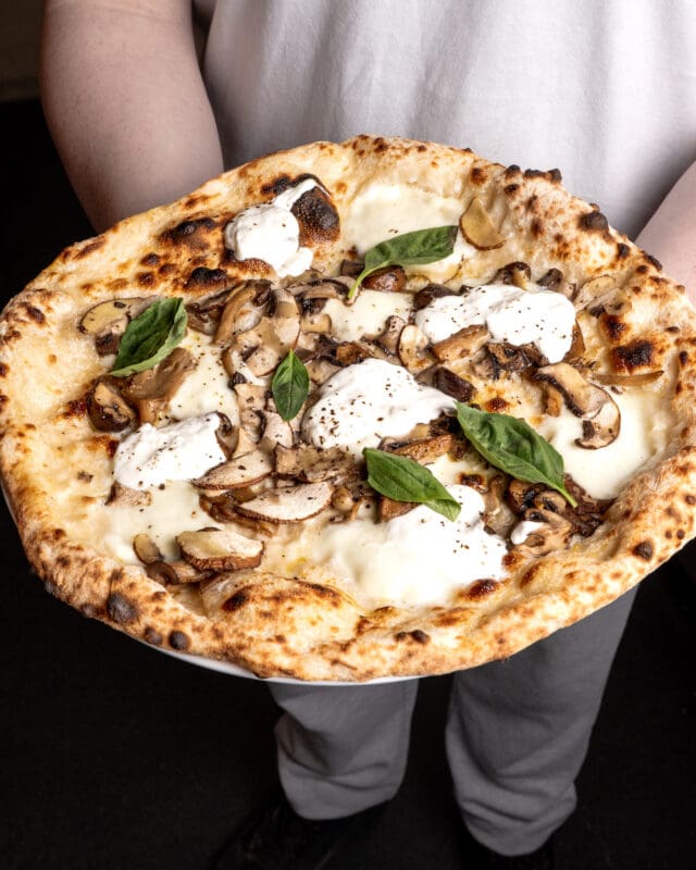 White pizza with Campanian buffalo mozzarella, garlic oil, oregano roasted chestnut, portobello + wild mushrooms roasted in garlic + thyme. Finished with fresh stracciatella from Puglia, sea salt + black pepper