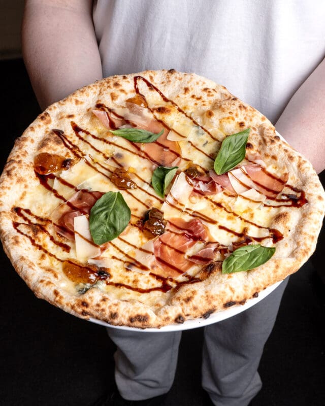 Fior di latte, DOP Gorgonzola, Asiago cheese + Emilia-Romagna prosciutto. Finished with fig jam, Campanian balsamic reduction + Grana Padano shavings