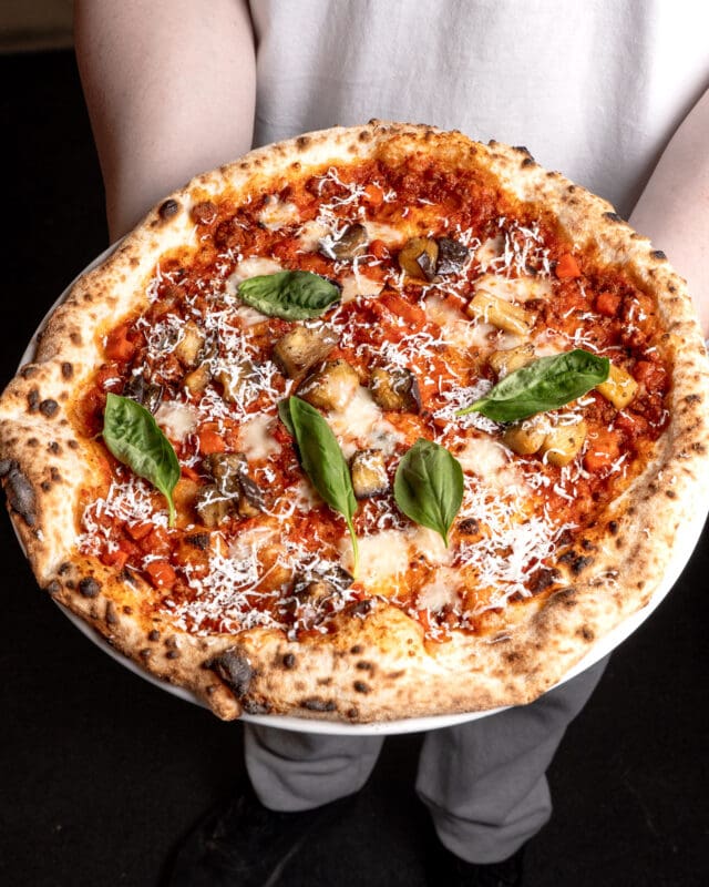 Bolognese ragu + San Marzano tomato base, topped with provolone piccante, Grana Padano, Vesuvian Piennolo tomatoes + aubergine roasted in garlic + sea salt. Finished with cracked black pepper + Sardinian ricotta salata