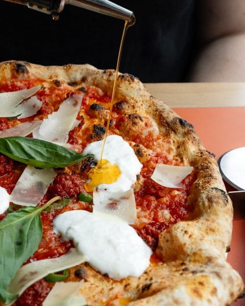 DIEGO’S DIAVOLA // Crushed San Marzano tomatoes, Grana Padano, spianata Calabrese Piccante, Calabrian ‘nduja, fresh green chilli, stracciatella, and Grana Padano shavings.